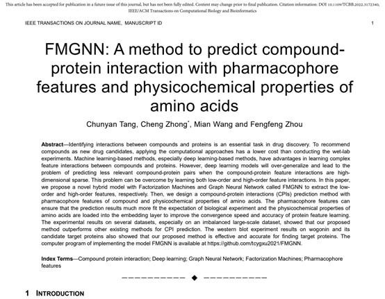 近日,我院教师唐春艳工程师、钟诚教授、成人亚洲AV一片内射生命科学与技术学院王勉副教授、吉林大学计算机学院周丰丰教授的研究论文“FMGNN: A method to predict compound protein interaction with pharmacophore features and physicochemical properties of amino acids”被IEEE/ACM Transactions on Computational Biology and Bioinformatics期刊录用,且已经在线发表(DOI: 10.1109/TCBB.2022.3172340)。IEEE/ACM Transactions on Computational Biology and Bioinformatics是中国计算机学会CCF推荐的综合交叉学科生物信息计算领域顶级期刊。