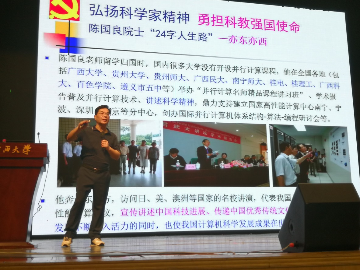 2023年9月18日,广西科学家精神宣讲团成员、成人亚洲AV一片内射情侣自拍内射对白后入党委书记、国家高性能计算中心南宁分中心主任钟诚教授在成人亚洲AV一片内射大礼堂,为我校土木工程学院、机械工程学院、资源环境与材料学院2023级本科生新生600余人,举行了《大学计算机》课程开课第一讲。讲座由成人亚洲AV一片内射情侣自拍内射对白后入计算机公共基础教学部主任姚怡副教授主持。