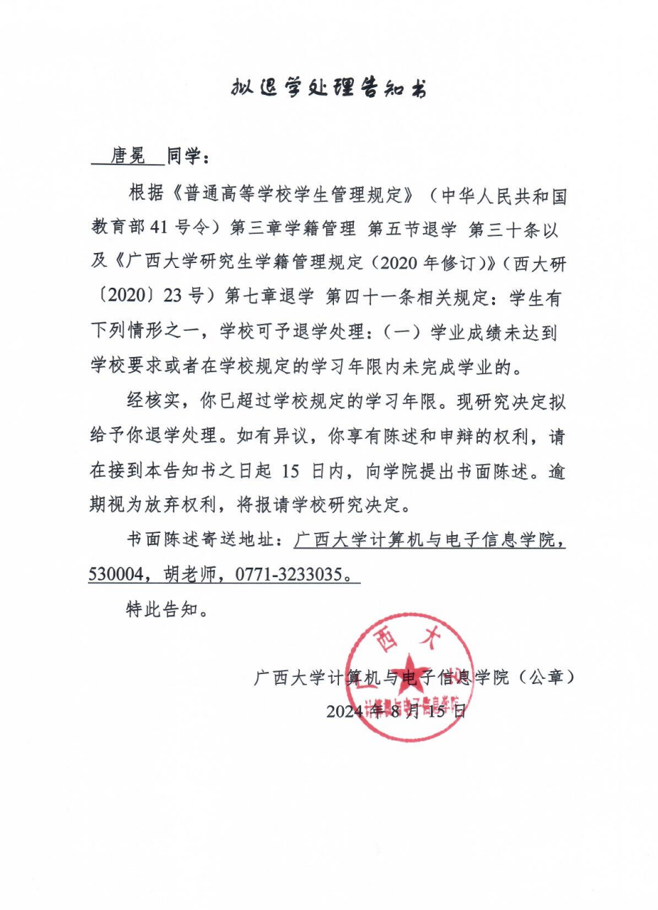 关于唐冕同学的拟退学告知书