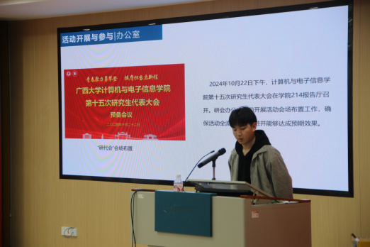 杨洋老师充分肯定了本次会议的重要意义,高度评价了研究生会及各班级学生干部在学院学生工作中的重要作用。她强调,研究生会要保持优良传统,结合人工智能热点话题积极探索新的工作思路,提高执行力和影响力,为学院的学生工作注入新的动力。