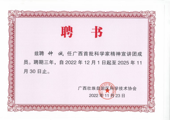 最近,广西壮族自治区科学技术协会颁发聘书,聘任我院钟诚教授为广西首批科学家精神宣讲团成员,聘期三年。广西首批科学家精神宣讲团成员积极参加科学家精神宣讲工作,大力学习宣传贯彻习近平新时代中国特色社会主义思想、党的二十大精神,大力宣传新时代胸怀祖国、服务人民、勇攀高峰、敢为人先、追求真理、严谨治学、淡泊名利、潜心研究、集智攻关、团结协作、甘为人梯、奖掖后学的科学家精神。